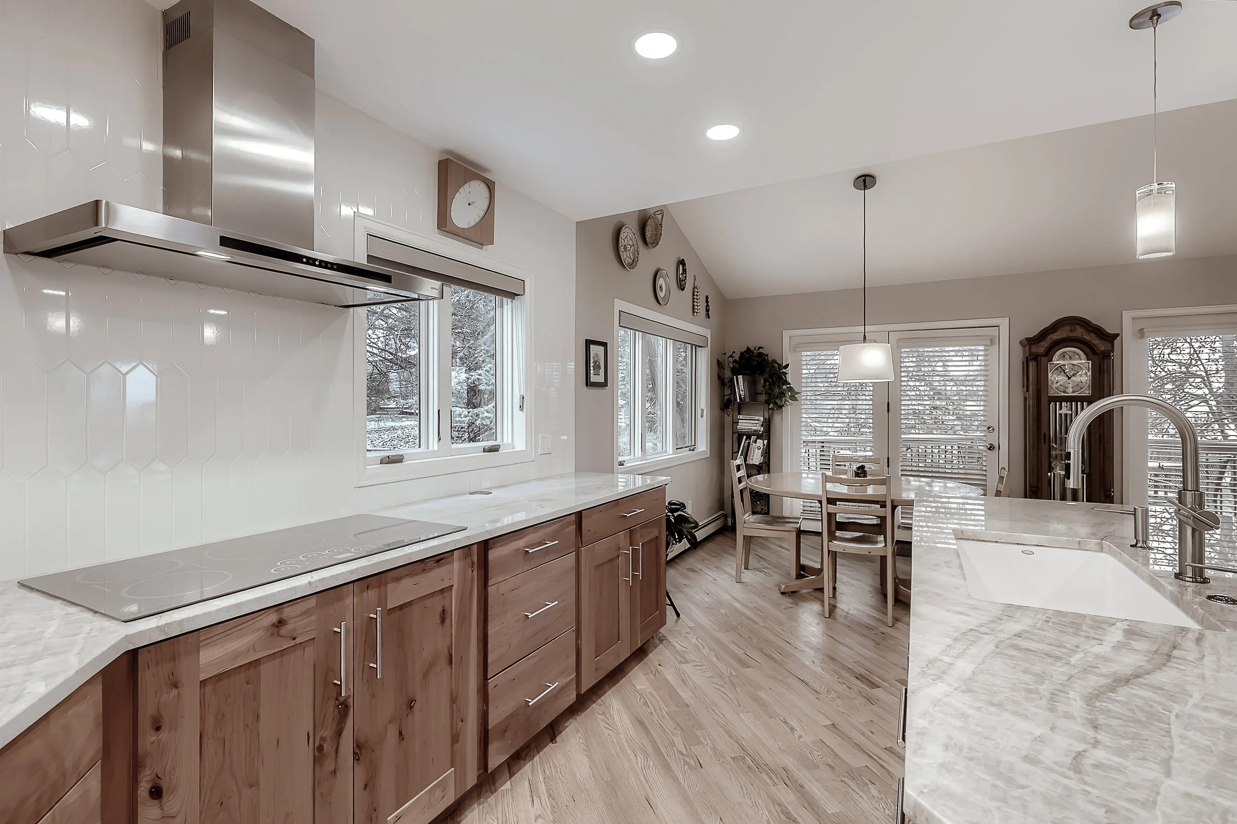 By opening the kitchen to the adjacent spaces it dramatically enhanced the natural light and airiness, creating a modern, inviting space meeting the clients design wishes.